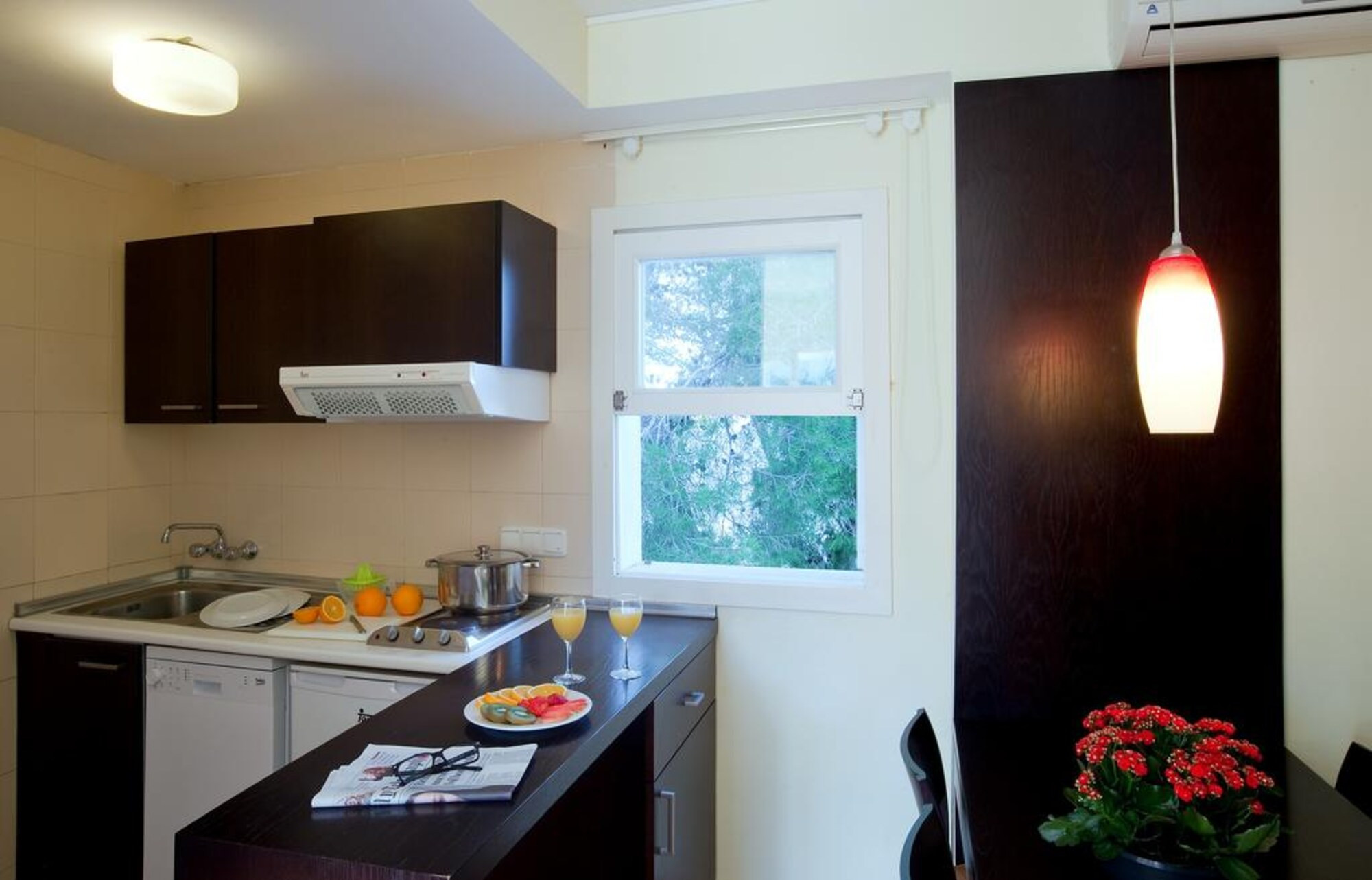 Casa de banho, Banheira, Secador, Telefone com ligação directa, Televisão, Acesso à Internet, Kitchenete, Cozinha, Frigorífico, Microondas, Cafeteira / Chaleira, Ar condicionado, Aquecimento central, Cofre, Sala de estar, Varanda, Terraço, Adaptado para pessoas com deficiência motora
